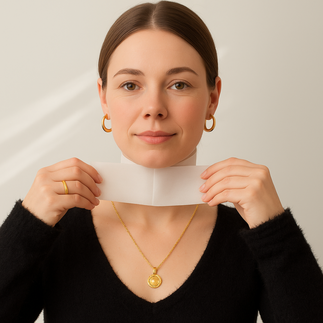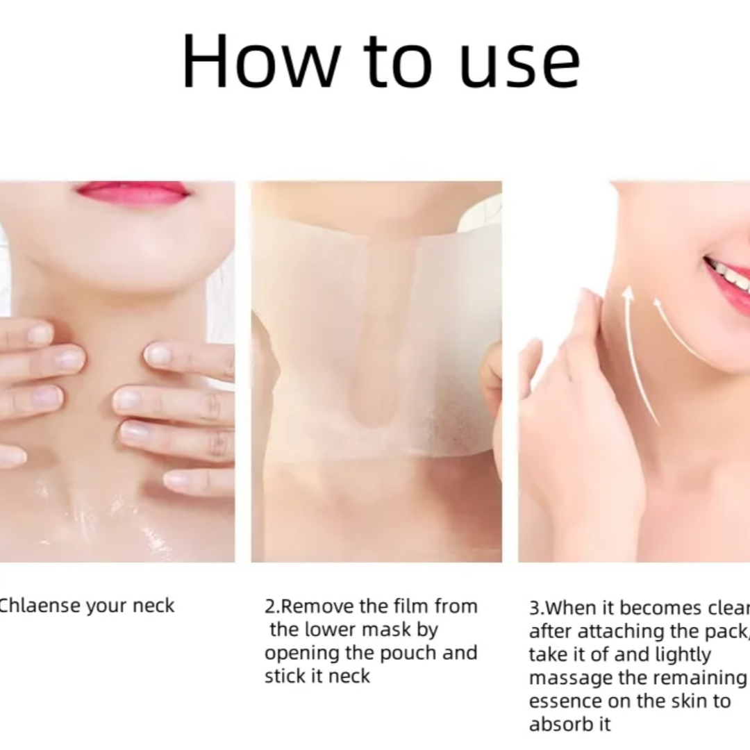 Измийте шията и нанесете подходящ овлажнител, изчакайте да попие, отстранете пластмасовото фолио, отпуснете шията и нанесете маската, след което я свалете, когато стане прозрачна. За по-добър ефект завършете с крем.